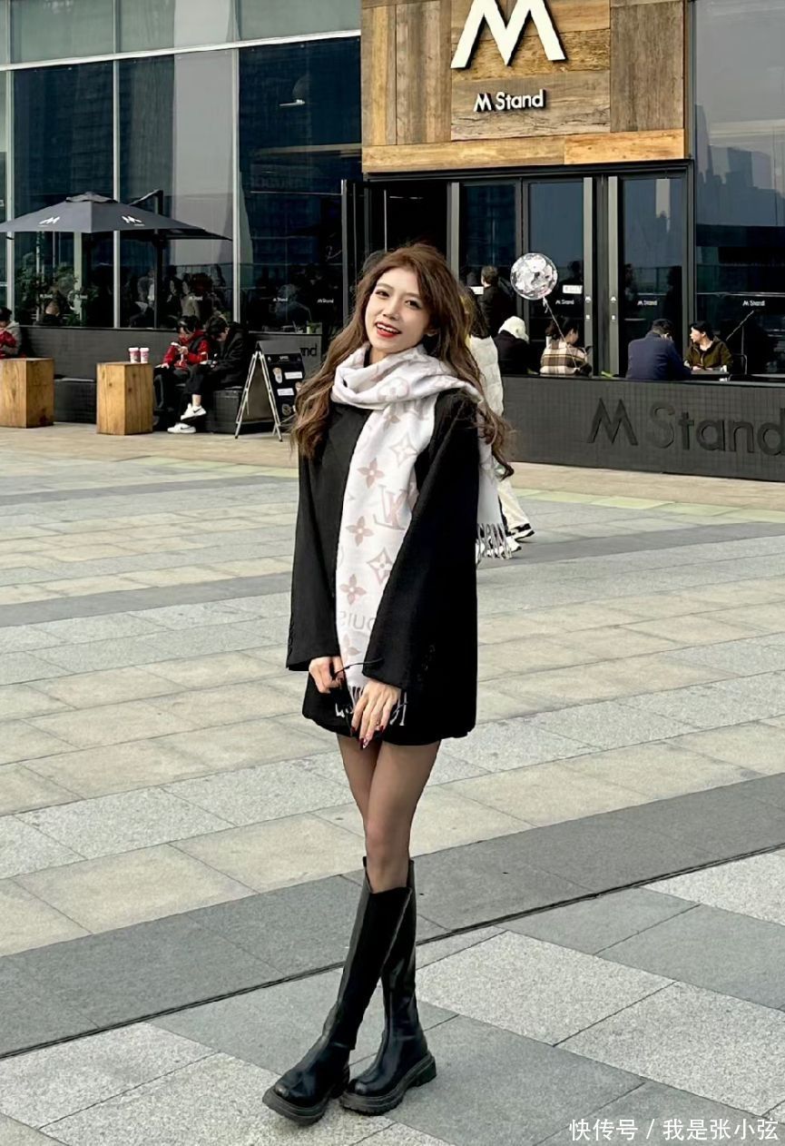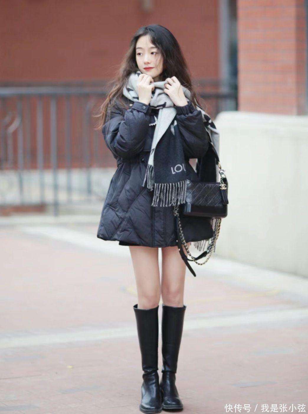 皇冠网投注LOOK3:收腰羽绒服+光腿神器+高筒靴